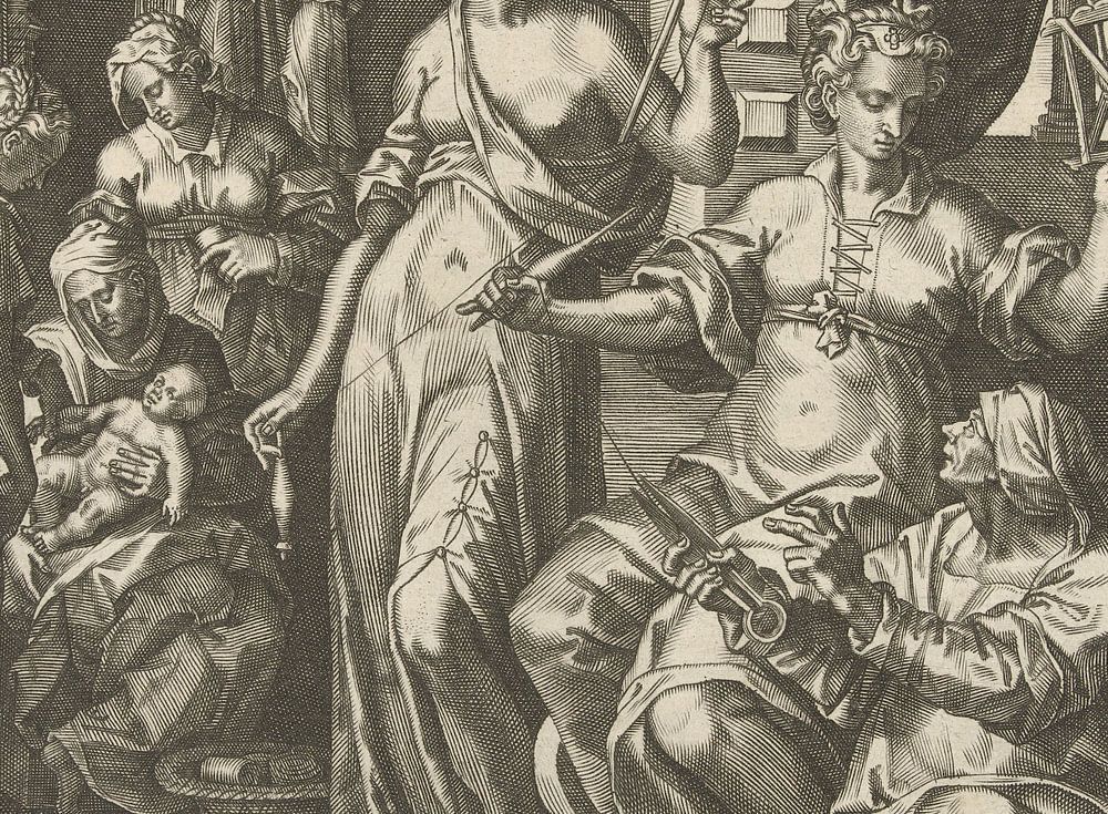 Die drei Göttinnen Lachesis, Atropos und Clotho sitzen in einem Raum und drehen den Faden des Lebens. Sie bestimmen den Lebensverlauf und die Lebensdauer, indem sie den Lebensdraht messen und schneiden. Einer hält den Kreisel, der andere verdreht den Draht und der dritte schneidet ihn ab. Rechts im Hintergrund spielen Kinder, links liegt eine Frau im Bett und drei Frauen kümmern sich um ein Neugeborenes. Der Druck ist Teil einer Reihe von allegorischen Drucken über das menschliche Leben.
