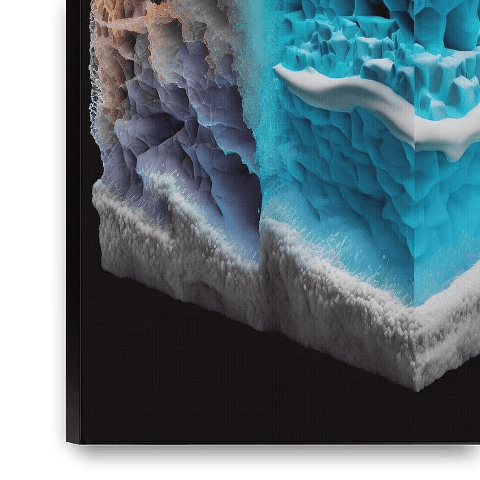 Gefrorene Schichten präsentiert einen faszinierenden Querschnittskubus einer eisigen Welt, der die geheimen Schichten unter seiner gefrorenen Oberfläche in atemberaubender Klarheit und lebendigen Farben offenbart. Die Struktur ist in verschiedene horizontale Zonen unterteilt, die jeweils eine andere Phase in der kryogenen Entwicklung…