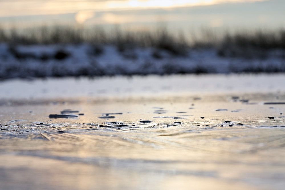 Dieses atemberaubende Bild fängt die subtile Schönheit eines gefrorenen Wintermorgens ein. Das Eis auf der Oberfläche eines stillen Teichs glitzert im weichen Licht der aufgehenden Sonne, während die eisigen Strukturen ein Gefühl von Frische und Gelassenheit hervorrufen. Der Hintergrund mit einem subtilen Horizont aus winterlicher Vegetation und einem gedämpften Himmel verleiht der Szene ein Gefühl von Tiefe und Raum.