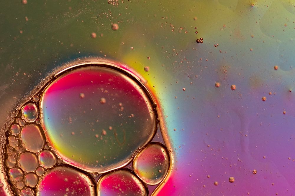 Seifenblasen in Öl ergeben einen farbenfrohen, aber auch chemischen Effekt, wobei eine Blase die anderen einkapselt.