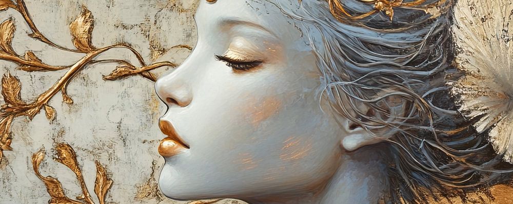 Gelassene Frau | Schmetterling mit goldenen Blättern - Dieses Gemälde für Frauen zeigt das Gesicht einer gelassenen Frau mit geschlossenen Augen, umgeben von goldenen Blättern und einem zarten weißen Schmetterling. Alles ist vor einem strukturierten, goldbraunen Hintergrund dargestellt, der die reichen Details des Rokoko-Stils aufweist.