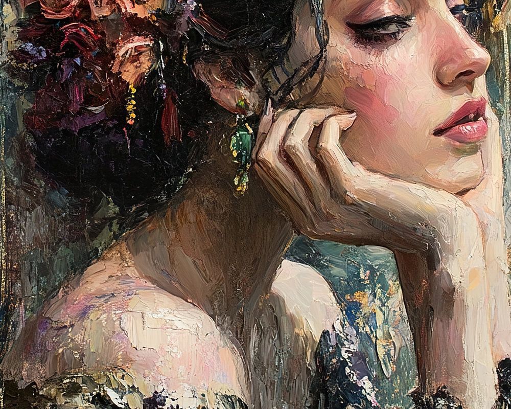 Details: Frauenporträt, Rokoko modern, Blumenkrone, Textur, Pinselstriche, ausdrucksstark, farbenfroh, heiterer Look