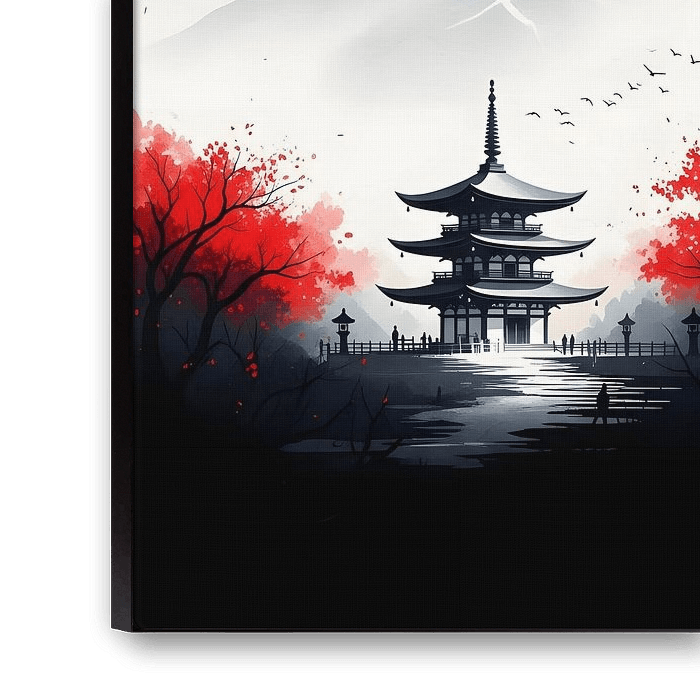 Bestelle dieses Landschafts-Wandbild Gelassene japanische Pagoden-Landschaft von Clay Artista als Reproduktion auf Leinwand, Alu-Dibond, als Poster, Fototapete oder Acrylglasbild.
