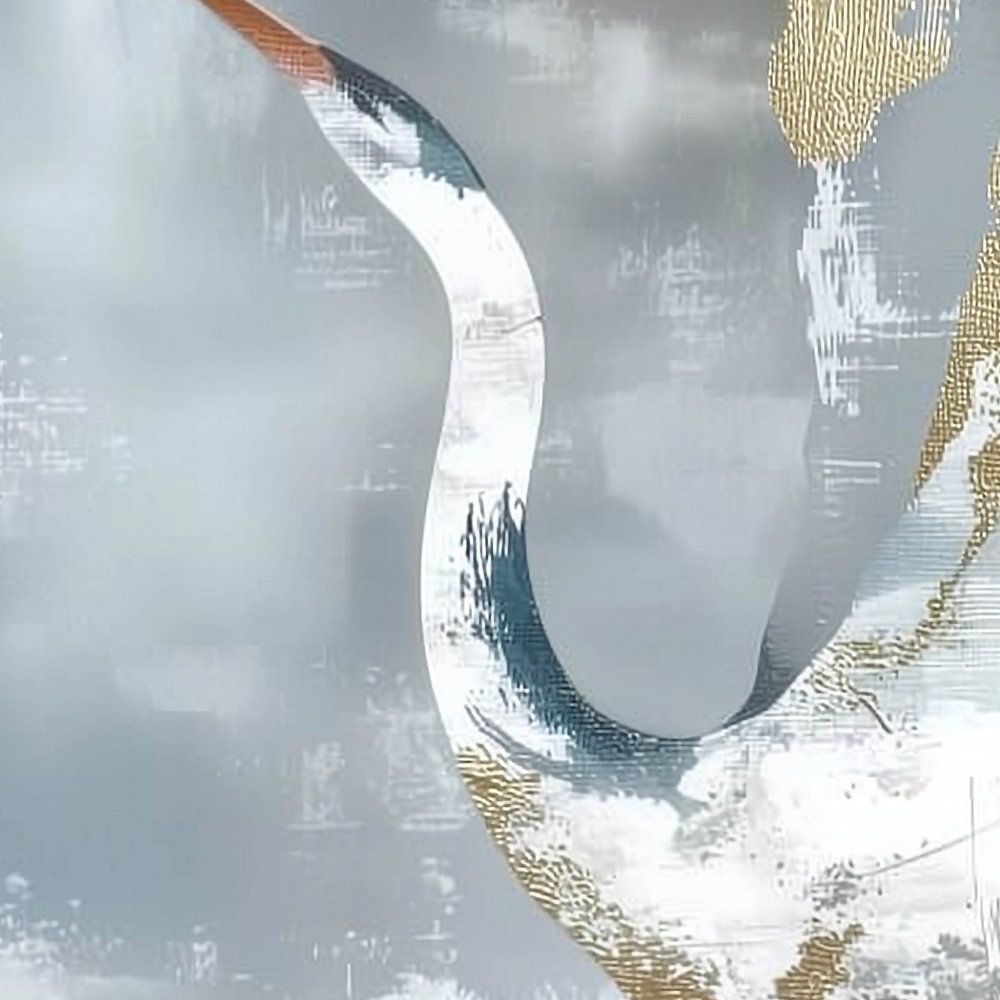 Anmutiger Reiher, dargestellt in einem stromlinienförmigen, minimalistischen Stil vor einem abstrakten, strukturierten Hintergrund. Die Komposition spielt mit dem Kontrast zwischen den feinen Details des Reihers und den breiten, groben Pinselstrichen seiner Umgebung. Die Verwendung von goldenen und blauen Akzenten bereichert das visuelle Erlebnis und verleiht ihm ein Gefühl von Luxus und Ruhe. In diesem Werk scheint der Reiher, der für seine stattliche Ruhe und Eleganz bekannt ist, zu einem Symbol für heitere Schönheit und Anmut erhoben zu werden.