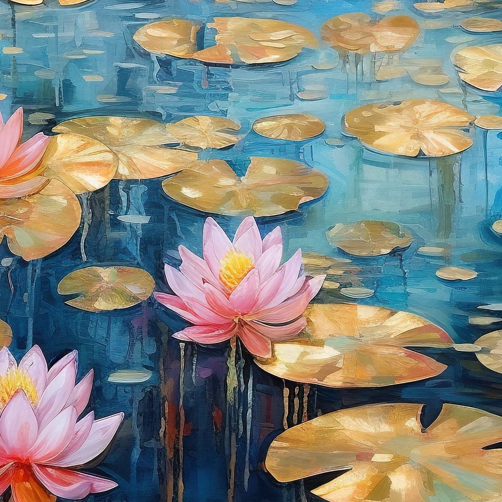 Serenity | Water Lily Art - Dieses lebhafte Ölgemälde zeigt eine üppige Szene von Seerosen, die sanft auf einer mystischen blauen Wasseroberfläche schwimmen, ergänzt durch Reflexionen und Nuancen von goldenem Laub. Der Künstler erweckt die Blumen mit zarten rosa und weißen Tönen vor dem Hintergrund von tiefblauen und grünen Farbtönen und schafft so ein Gefühl von heiterer Schönheit, das eine beruhigende Atmosphäre in jedes Interieur bringt.