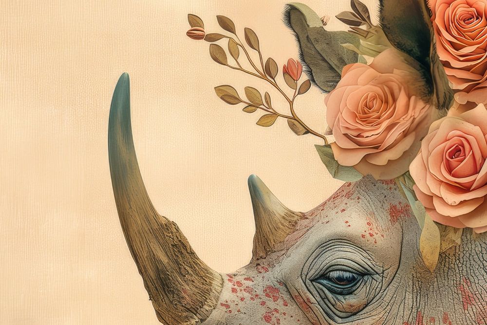 "Serenity in Firmness" ist ein einzigartiges Kunstwerk, das die Stärke und Robustheit eines Nashorns mit der zarten Schönheit von Rosen verbindet. Das imposante Tier ist mit einer wunderschönen Krone aus rosafarbenen Rosen und grünen Blättern geschmückt, die einen bezaubernden Kontrast zwischen roher Stärke und zerbrechlicher Schönheit bilden. Der weiche, pastellfarbene Hintergrund hebt die detaillierten Texturen der Haut und der Blütenblätter des Nashorns hervor. Dieses Kunstwerk ist perfekt für Naturliebhaber und alle, die ihren Innenräumen einen Hauch von Eleganz und Stärke verleihen möchten.