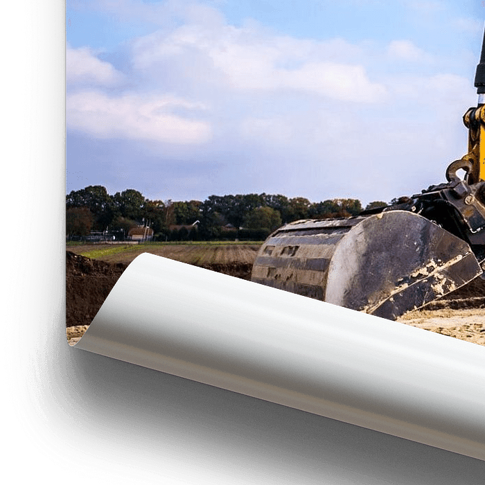Bestelle das Foto Gelber Bagger beim Straßenbau von Günter Albers als Reproduktion auf Leinwand, Alu-Dibond, als Poster, Fototapete oder Acrylglasbild.