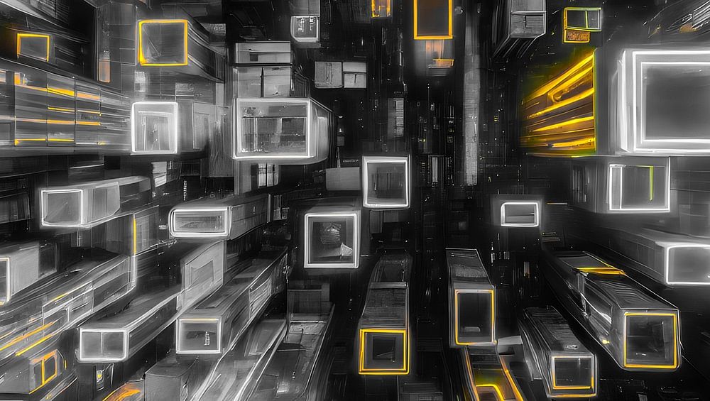 Dieses Werk ist ein visuelles Spektakel, das den Betrachter durch eine abstrakte Stadtschlucht führt, die von dynamischen gelben Linien beleuchtet wird, die Leben und Bewegung suggerieren. Das Kunstwerk ist eine Kombination aus digitaler Kunst und Futurismus, die die Komplexität der modernen Architektur mit der Energie von Licht und Farbe verbindet.