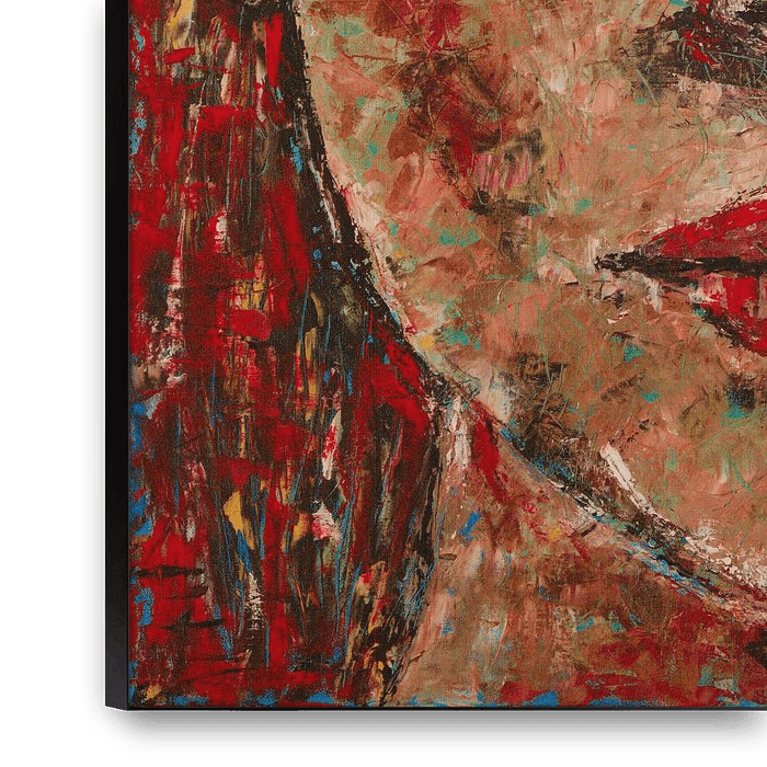 Ich habe es mit mehreren Schichten Ölfarbe gemalt. Der rote Hintergrund verleiht dem Bild eine intensive Atmosphäre. Das Original ist 80 x 80 cm groß.