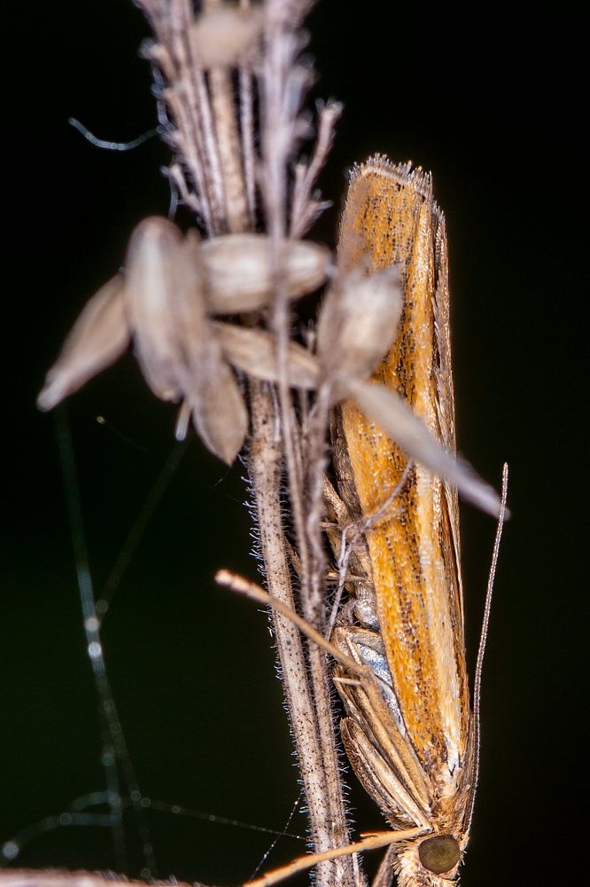 Im ersten sanften Morgenlicht ruht sich eine gemeine Grasmotte auf einer verdorrten Grasähre aus. In der feinen Textur ihrer Flügel, den weichen Haaren und dem zarten Zusammenspiel von Gras und Motte entfaltet sich eine verborgene Welt.