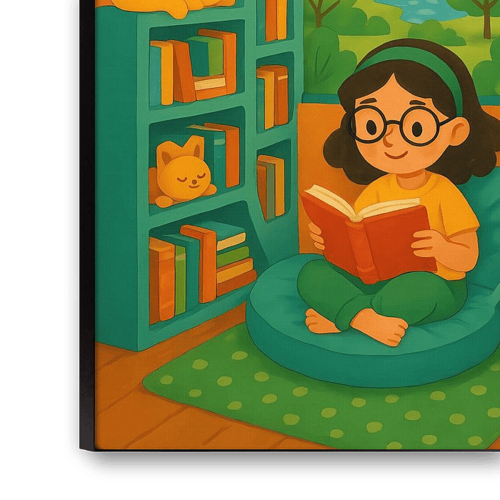 Eine warme und charmante Illustration eines jungen Mädchens, das in einem gemütlichen Raum voller Bücher eine ruhige Lesestunde genießt. Die Szene zeichnet sich durch weiche Beleuchtung, verspielte Katzen, die sich auf Bücherregalen ausruhen, und üppige grüne Pflanzen aus, die zu der ruhigen Umgebung beitragen. Durch ein großes Bogenfenster sieht man die Skyline der Stadt und einen belebten Park, der ein friedliches Gleichgewicht zwischen Natur und Stadtleben schafft. Dieses Kunstwerk fängt die Freude am Lesen, den Komfort einer persönlichen Ecke und die entspannende Einfachheit eines ruhigen Nachmittags ein.