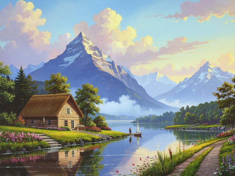 Dies ist ein generiertes KI-Kunstwerk, das sich gemütlich anfühlt, wenn es in Ihrem Wohnzimmer oder an einem anderen Ort platziert wird. Die Landschaft der Ansicht ist kalt aussehen, aber warm auf der anderen Seite, wie am Morgen.