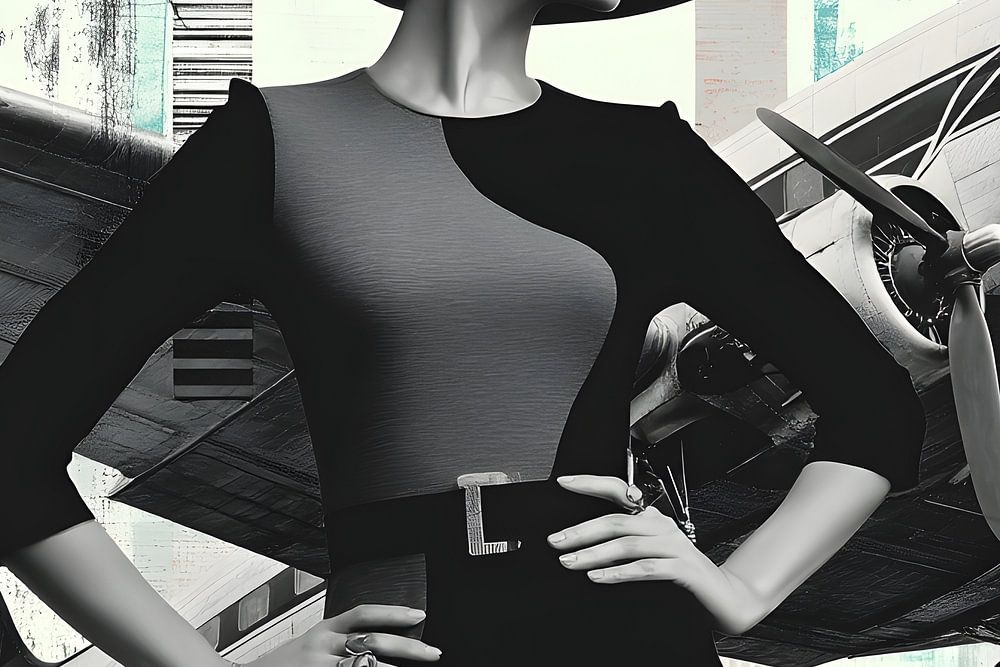 Die Komposition verbindet zeitlose Eleganz mit dem Aufbruch in eine neue Ära des Reisens und fängt den Geist der Mode und des Fortschritts der 1930er Jahre ein.