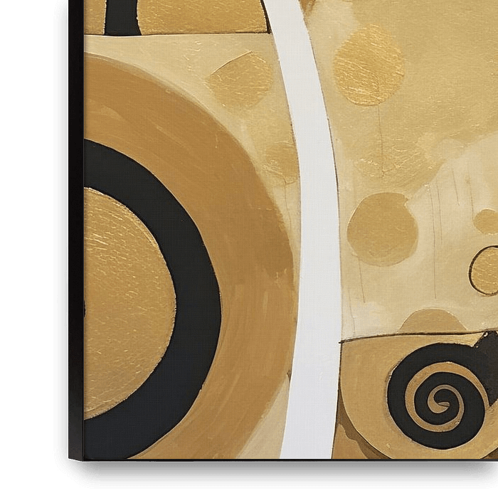 Geometric Harmony | Abstract Gold Art - Die Leinwand zeigt eine abstrakte Komposition mit wellenförmigen und geometrischen Formen, ein harmonisches Zusammenspiel von Goldtönen mit schwarzen und weißen Akzenten. Die detaillierten Muster und Texturen fügen ein taktiles Element hinzu und die subtilen blauen und braunen Details verleihen…