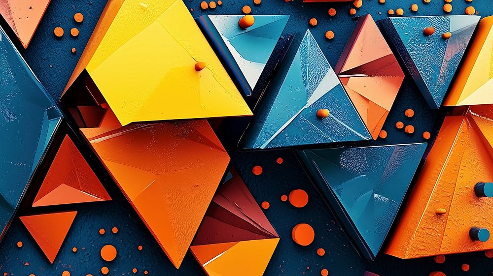 Das Bild zeigt eine dreidimensionale Anordnung von Pyramiden und Kreisen in leuchtendem Orange und Blau. Die dynamische Struktur und kräftigen Farben erzeugen ein modernes, energiegeladenes Design.