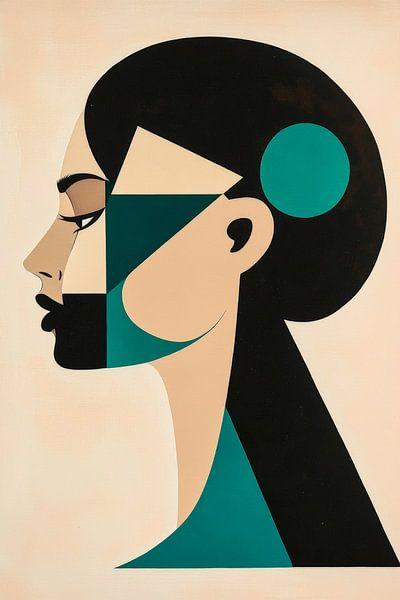 In faszinierenden geometrischen Formen und kühlen Farben entfaltet sich das Porträt einer stilisierten Frau, deren Ausdruck sowohl nachdenklich als auch stark wirkt. Die harmonische Verbindung von Schwarz, Türkis und sanften Beigetönen verleiht diesem Kunstwerk eine moderne Eleganz. Perfekt geeignet für ein kreatives Büro oder ein…