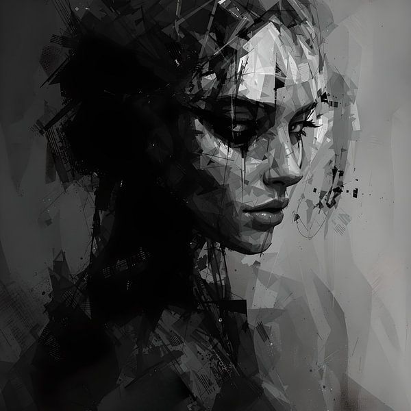 Beschreibung: "Ein markantes abstraktes Porträt, das Realismus mit digitaler Glitch-Ästhetik verbindet. Der hohe Kontrast in Schwarz und Weiß macht dieses Werk perfekt für moderne und industrielle Innenräume.
