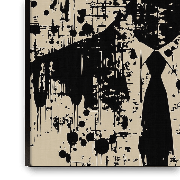 Eine markante Silhouette eines gesichtslosen Mannes im Anzug, umgeben von kräftigen Spritzern und Texturen. Dieses minimalistische und doch geheimnisvolle Kunstwerk symbolisiert Identität, Konformität und Individualität - perfekt für Kleidung, Wandkunst oder Statement-Stücke für Liebhaber moderner Kunst.