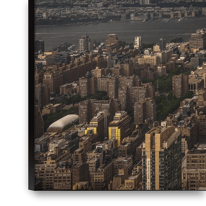 Dieses Foto wurde vom Empire State Building in New York City aus aufgenommen. Ein bedrohliches Gewitter zog auf, und das Licht wurde kontrastreich und farbenprächtig. Ein paar Wolkenkratzer fingen noch die letzten Sonnenstrahlen ein, die durch die Wolkendecke brachen. Im Hintergrund fließt der Hudson River, und man sieht die im Hafen…