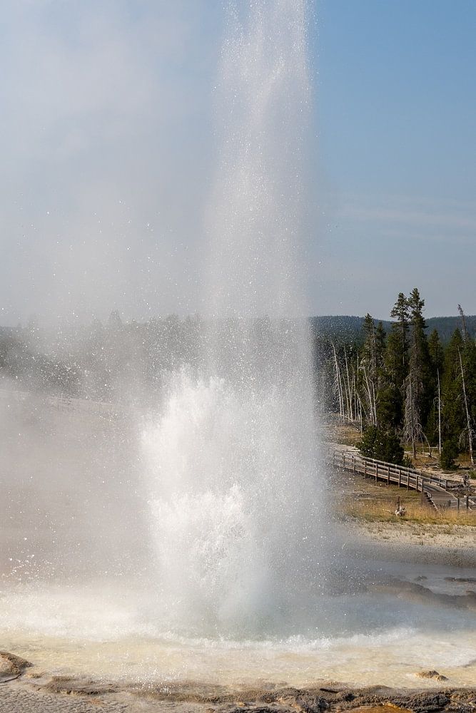 Im Park gibt es etwa 10.000 heiße Quellen und mehr als 200 Geysire im Upper Geyser Basin, von denen Old Faithful der berühmteste ist. Dieser Geysir stößt alle 45 bis 125 Minuten eine 45 Meter hohe Wasser- und Dampfsäule aus, im Durchschnitt alle 92 Minuten. Einige andere berühmte Geysire sprudeln nur alle 6 bis 8 Monate, und es gibt Geysire, die seit Jahren nicht mehr sprudeln.
