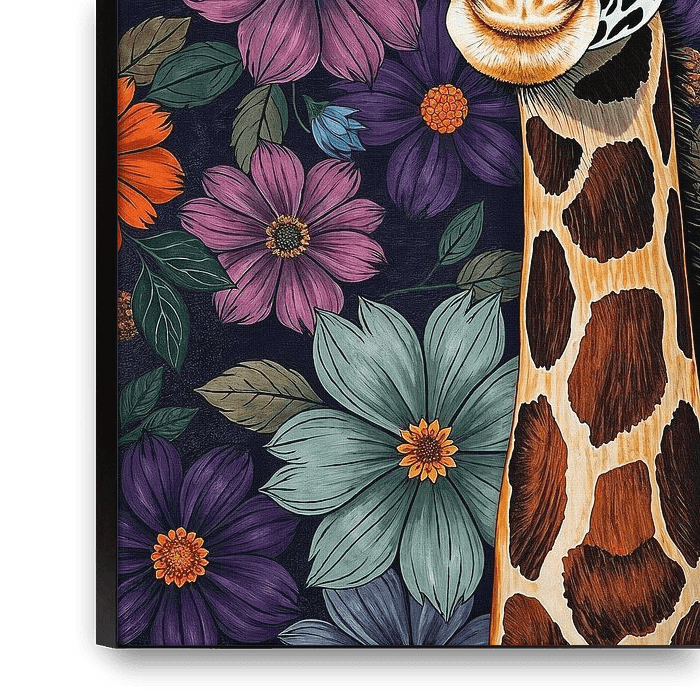 Eine Giraffe integriert im floralen Muster bzw. in Blumen. Dezente und dennoch kräftige Farben, die in fast jeden Raum passen.