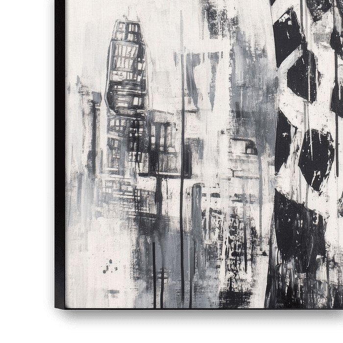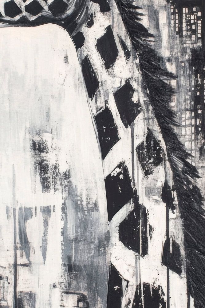 Ein majestätisches Wesen erhebt sich elegant vor einer urbanen Kulisse, in monochromen Schwarz-Weiß-Tönen. Die markanten Flecken der Giraffe kontrastieren mit den abstrakten, grauen Strukturen im Hintergrund. Ihre geduldige Ausstrahlung und der imposante Hals verleihen dem Bild eine mysteriöse, fast träumerische Atmosphäre und laden zum Staunen ein.