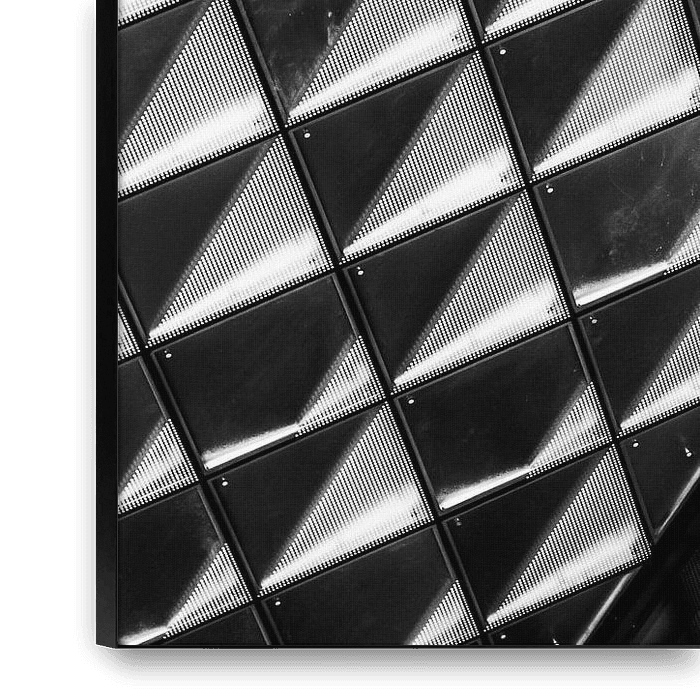 Das Kunstwerk zeigt die Glasfassade des Futuriums in Berlin in einer Schwarz-Weiß-Komposition. Im Fokus stehen die geometrischen Muster aus Dreiecken und Rechtecken, die durch die Anordnung der Glasplatten entstehen. Reflektionen und Schatten auf der Oberfläche erzeugen ein komplexes Spiel aus Licht und Struktur. Im oberen Bereich sind…