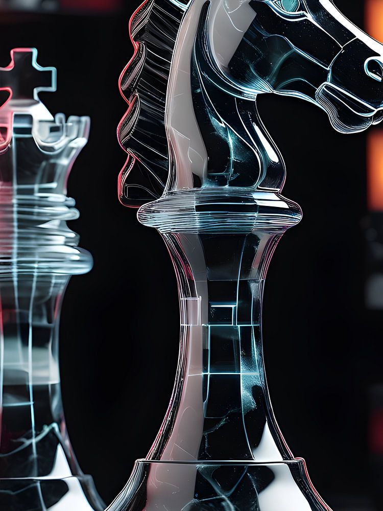 In diesem Kunstwerk werden gläserne Schachfiguren durch ein futuristisches Spiel von Licht und Schatten zum Leben erweckt. Das Werk wird von einem transparenten Pferd dominiert, dessen glänzende Oberfläche seine Umgebung reflektiert und bricht. Die Einflüsse von Kubismus und Futurismus sind deutlich zu erkennen. Klare Linien und geometrische Formen verbinden sich zu einem dynamischen und zeitgenössischen Look.