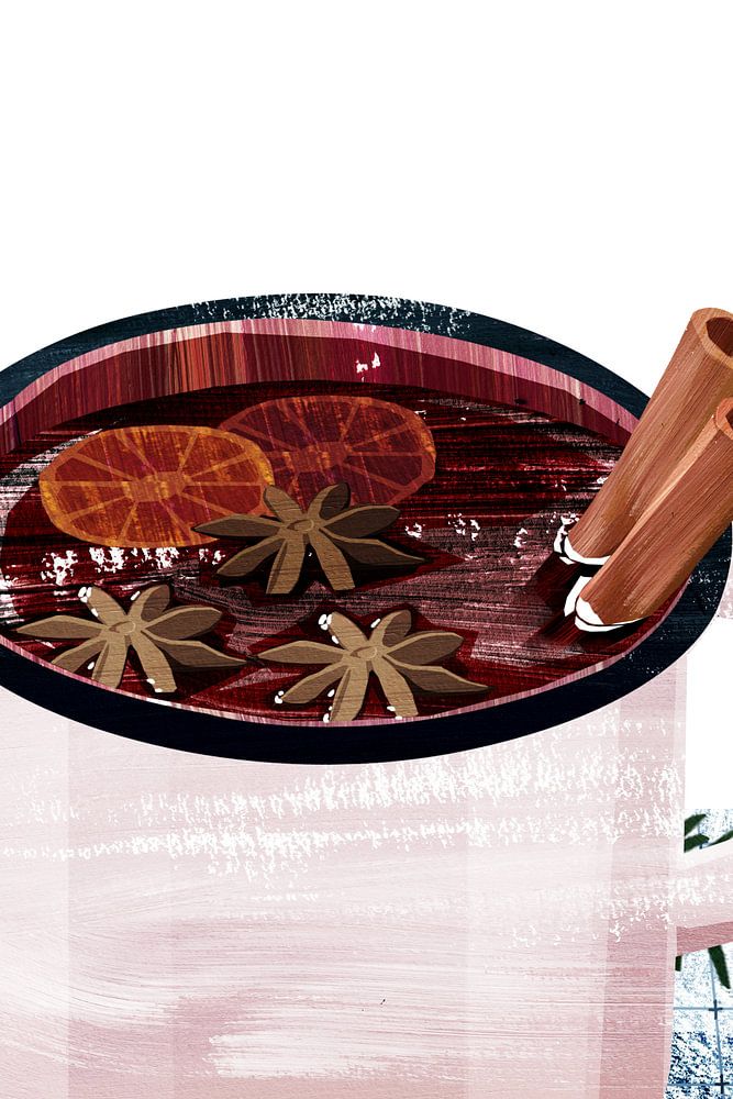Gemütliche Winterillustration eines Bechers Glühwein mit Zimtstangen und Sternanis. Kleine Tannenzweige auf dem Tischtuch sorgen für Weihnachtsstimmung.