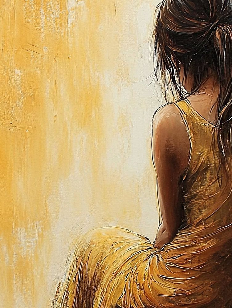 Gold | Woman in Gold - Dieses Frauengemälde zeigt eine Frau, die mit dem Rücken zum Betrachter sitzt und in ein goldenes Kleid gehüllt ist, vor einem reichhaltigen, strukturierten, goldenen Hintergrund.