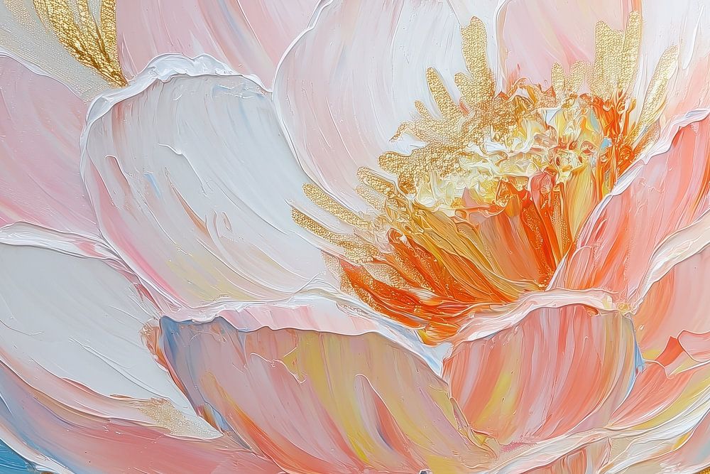 "Golden Bloom" ist ein abstraktes Gemälde, das die Raffinesse einer Blume in ihrer ganzen zarten Pracht einfängt. Das Werk spielt mit sanften Rosa- und Goldtönen, die sich in wellenförmigen Mustern elegant umarmen. Die Blütenblätter erwachen in einer bezaubernden Farbpalette aus Blau, Weiß, Gelb und Orange zum Leben, während goldene Spiralen einen magischen Touch verleihen. Diese fließenden Linien sorgen für ein Element der Bewegung, so als würde sich die Blume im sanften Licht langsam öffnen.