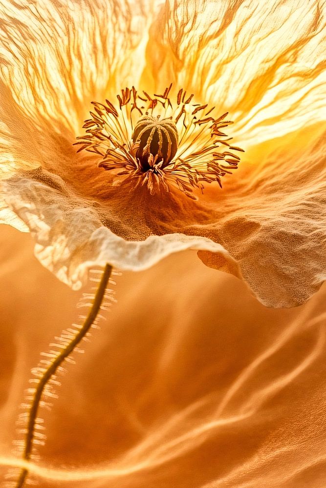 Dieses wunderschöne Design zeigt eine zarte Blume, die von warmen Lichtstrahlen umgeben ist, die eine verträumte Atmosphäre hervorrufen. Die weichen, wellenförmigen Strukturen, die die Blume umrahmen, verstärken das Gefühl von Bewegung und Gelassenheit. Es eignet sich ideal als Dekoration für moderne Innenräume und bringt ein Gefühl von Ruhe und Eleganz in jeden Raum. Perfekt für Liebhaber von Naturkunst und minimalistischem Design.