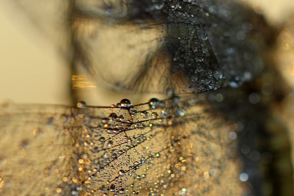 Diese Libelle wurde durch das Sonnenlicht, das auf die Tautropfen auf ihren Flügeln schien, zu einem Schmuckstück. Dadurch entstand ein schöner Schimmer.