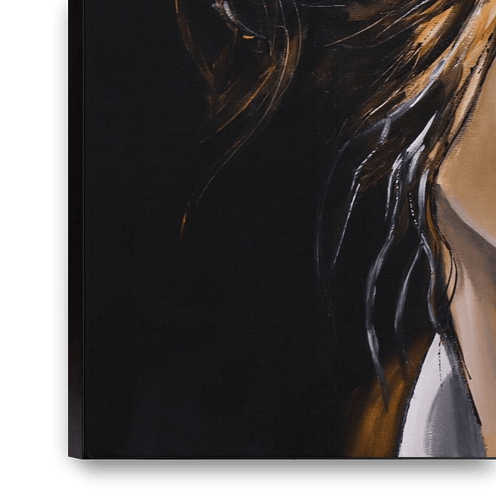 Dieses beeindruckende Porträt zeigt eine schöne Frau, die in einem Moment eleganter Kontemplation festgehalten ist. Ihr Gesicht, umrahmt von dunklen Tönen und zarten goldenen Reflexen, strahlt eine zarte und doch kraftvolle Ausstrahlung aus.
