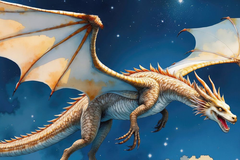 Majestätischer goldener Drache, der mit ausgebreiteten Flügeln vor einem Wolkenhintergrund durch den nächtlichen Sternenhimmel schwebt
