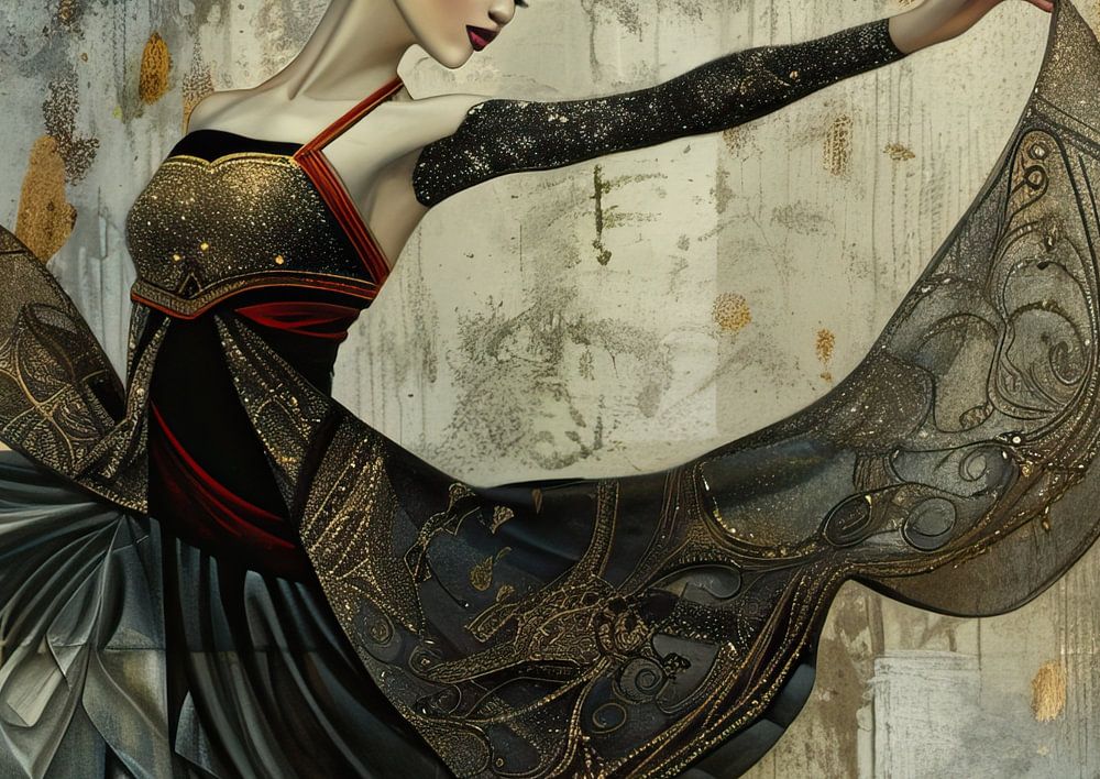 Golden Dance Silhouette - Dieses Frauengemälde zeigt eine elegante Tänzerin in einem dramatischen schwarz-gold verzierten Kleid vor einem Hintergrund aus verwitterten, vergoldeten Mustern.