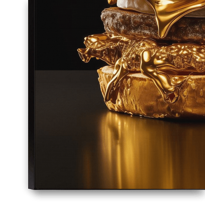 Dieses Kunstwerk zeigt ein goldenes Hamburgerbrötchen. Der Käse ist geschmolzen und sieht aus wie geschmolzenes Gold. Das Brötchen ist ebenfalls aus Gold. Das Brötchen spiegelt sich im Vordergrund. Der Hintergrund ist schwarz.