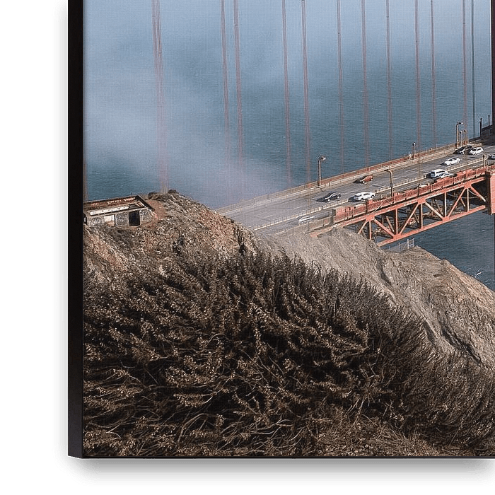 Bestelle dieses Landschafts-Wandbild Goldenes Tor im Nebel von John Faber als Reproduktion auf Leinwand, Alu-Dibond, als Poster, Fototapete oder Acrylglasbild.