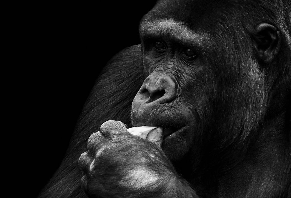 Gorilla beim fressen auf schwarzem Hintergrund, schwarz-weiß Fotografie.