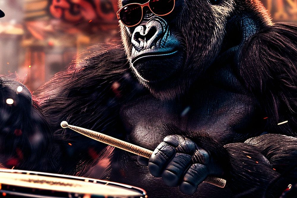 Ein kraftvolles und auffälliges Design eines Gorillas, der als Schlagzeuger in einer stimmungsvollen, dynamischen Umgebung voll in seinem Element ist. Das Bild strahlt Energie aus und kombiniert eine spielerische und surreale Atmosphäre mit einem coolen und musikalischen Thema. Perfekt für Musikliebhaber oder alle, die mutige, einzigartige Kunst für ihr Zuhause oder Büro lieben.