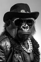 Dieses Foto zeigt einen Gorilla, stilvoll gekleidet in einer Lederjacke und Sonnenbrille. Er trägt auch eine Kette und einen Hut, was ein humorvolles und einzigartiges Bild schafft.