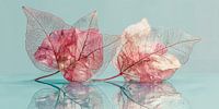 Dieses subtile Kunstwerk zeigt zwei zarte, durchscheinende Blätter in warmen Rosa- und Weißtönen, die sich elegant vor einem ruhigen blauen Hintergrund abheben. Die feine Struktur der Blattadern wird durch sanfte Reflexionen hervorgehoben und erzeugt eine beinahe meditative Atmosphäre. Das Werk vereint botanische Präzision mit…