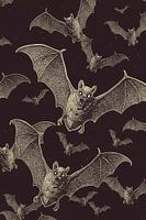Dieses komplizierte Muster zeigt einen Schwarm realistischer Fledermäuse vor einem dunklen, strukturierten Hintergrund, der die stimmungsvolle Essenz der viktorianischen Illustration einfängt. Jede Fledermaus ist mit einer feinen Linienführung versehen, die die natürlichen Strukturen ihrer Flügel und ihres Fells zur Geltung bringt.…