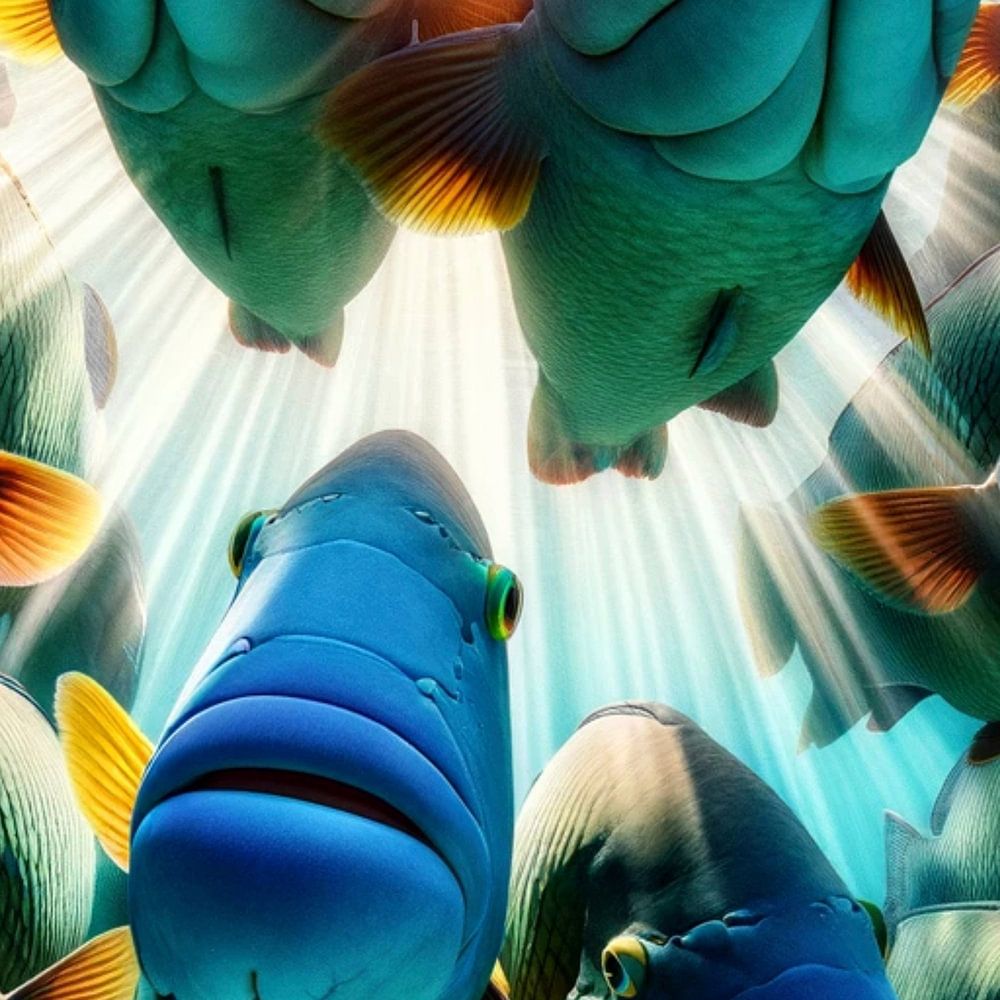 "Goup of Napoleon fishes", generiert durch DALL-E, ist eine strahlende Darstellung einer Gruppe von Napoleonfischen, auch bekannt als Humphead Wrasse, die sich unter dem Sonnenlicht im klaren Blau der Ozeane tummeln. Die Napoleonfische, die mit ihren markanten Stirnhöckern und leuchtend blauen Farbtönen, welche hier im Bild kunstvoll hervorgehoben werden, sind sofort erkennbar. Sie schwimmen in perfekter Symmetrie, die durch die zentral platzierte Sonne, die ihre Strahlen durch das Wasser sendet, noch verstärkt wird.