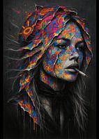 Ein monochromes Frauenporträt wird von einer leuchtenden Schicht aus Graffiti überzogen, die wie zerrissenes Papier vom Gesicht und den Haaren abblättert. Neonfarben in Blau, Pink, Orange und Gelb bilden wirre Symbole und Schriftzüge, die im starken Kontrast zur grauen Haut und dem dunklen Hintergrund stehen. Der ernste Blick und die…