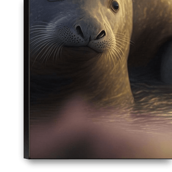 Dieses hyperrealistische Kunstwerk fängt einen ruhigen Moment ein, in dem eine Gruppe von Kegelrobben friedlich im Meer schwimmt, gebadet im warmen Schein der tief stehenden Sonne. Das weiche, goldene Licht wird von den sanften Wellen reflektiert und hebt die nassen Fellstrukturen der Robben mit bemerkenswerten Details hervor. Die…