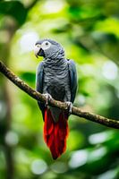 Inmitten des leuchtenden Grünen des Dschungels thront ein grauer Papagei mit majestätischem, rotem Schwanz. Sein neugieriger Blick und die elegante Körperhaltung vermitteln eine Mischung aus Anmut und Wachsamkeit. Die Farbenpracht seiner Gefieder fungiert als ein lebendiges Zeugnis der Natur, das die Sinne betört und zum Staunen einlädt.