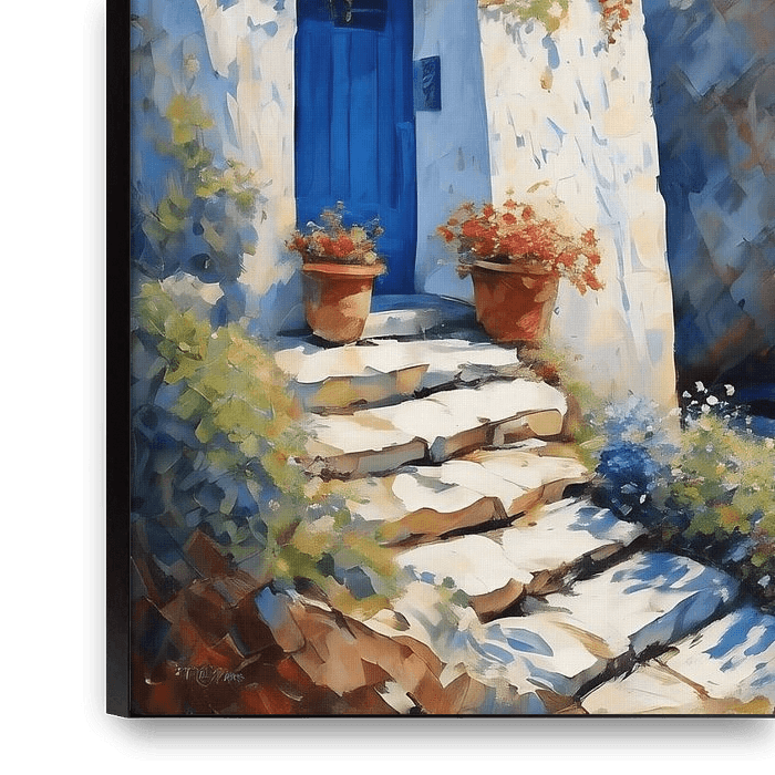 Möchten Sie auch nach Ihrem Urlaub noch das tolle Urlaubsgefühl genießen? Dann hängen Sie dieses Kunstwerk an Ihre Wand und erleben Sie jeden Tag eine sonnige Stimmung. Weiße Häuser mit blauen Fensterläden, Felsen und blaues Meer. Impressionistischer Stil, um die Atmosphäre besonders gut zu machen.