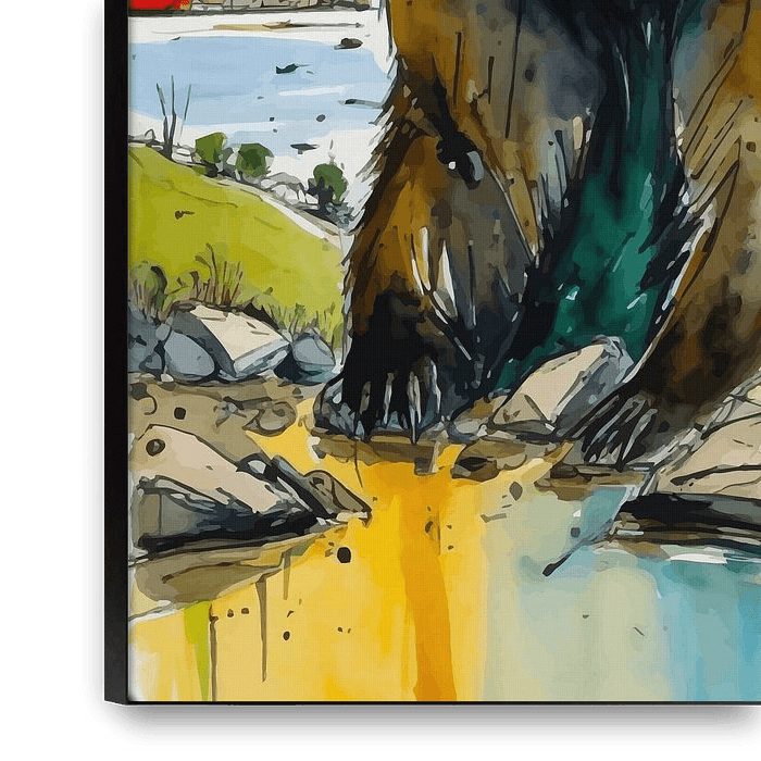 Das Aquarell eines Grizzlybären zeigt ein reich strukturiertes Fell in Braun-, Gold- und Rotbrauntönen, das seine kraftvolle und imposante Präsenz unterstreicht. Die weichen, fließenden Pinselstriche erinnern an die raue Form und die natürliche Stärke des Bären, während seine ausdrucksstarken Augen und seine muskulöse Haltung dem Bild…