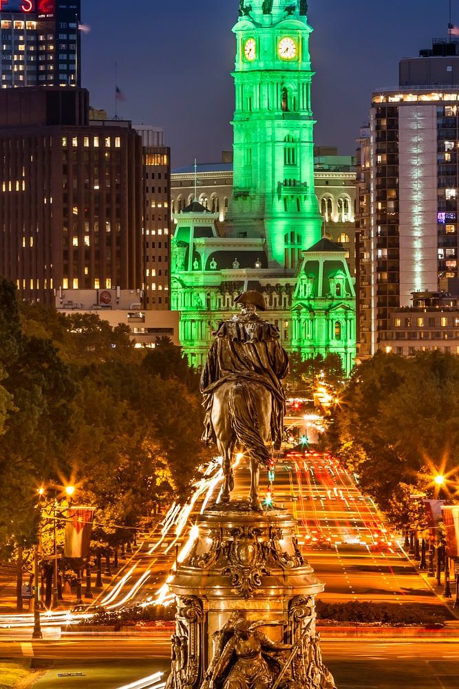 Die Ansicht der Philadelphia City Hall am Abend ist ein atemberaubendes Erlebnis. Die Lichter der Autos ziehen sich wie leuchtende Linien durch das Bild und verleihen der Szene eine lebendige Dynamik. Im Vordergrund befindet sich das Washington Monument und dahinter erhebt sich majestätisch die ikonische Statue von William Penn auf der Spitze der imposanten City Hall mit ihrer prächtigen Architektur in den Himmel. Das Gebäude wurde 1871 bis 1901 im viktorianischen Stil erbaut. Der Uhrenturm auf der Nordseite ist 167,03 m hoch und damit das höchste gemauerte Gebäude der Welt.